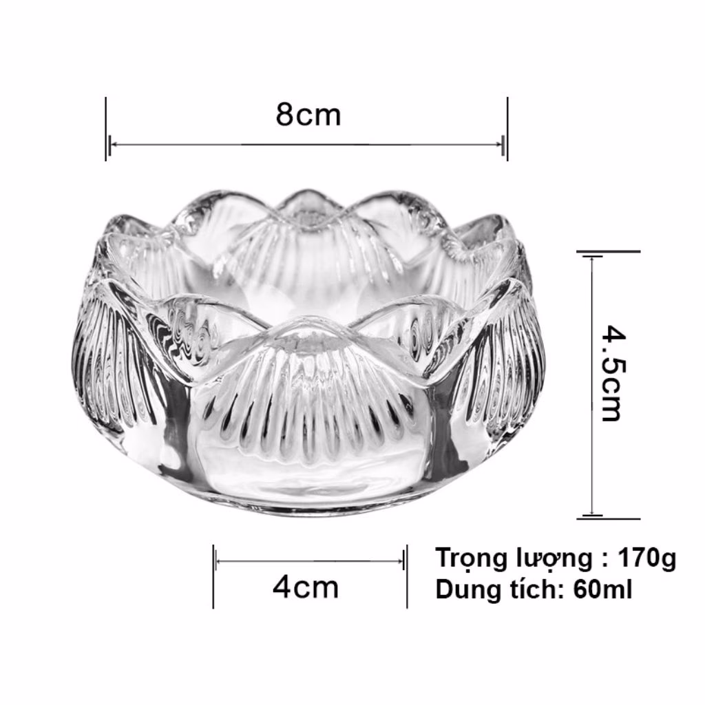 Với kích thước 4x8x4.5cm và thể tích 60ml, chum sen thủy tinh phù hợp với nhiều loại nến khác nhau. Bạn có thể sử dụng chum sen để đốt nến tealight, nến trụ nhỏ, hoặc làm đèn dầu thơm. Sản phẩm thích hợp để trang trí bàn thờ, phòng khách, phòng ngủ, spa, nhà hàng, khách sạn...